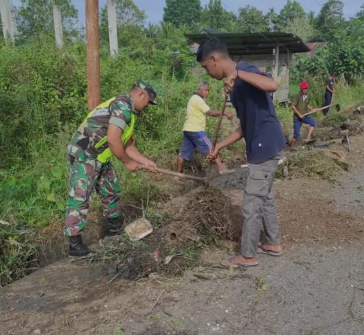 Upaya untuk memelihara jalan agar tetap bersih dan rapi, Sertu Riki Babinsa Koramil 07/Blangjerango Kodim 0113/Gayo lues bersama Perangkat Desa dan warga melaksanakan gotong royong membersihkan kiri kanan jalan Desa Peparik dekat Kecamatan Blangjerango kab gayo lues . Sabtu (18/04/2026).