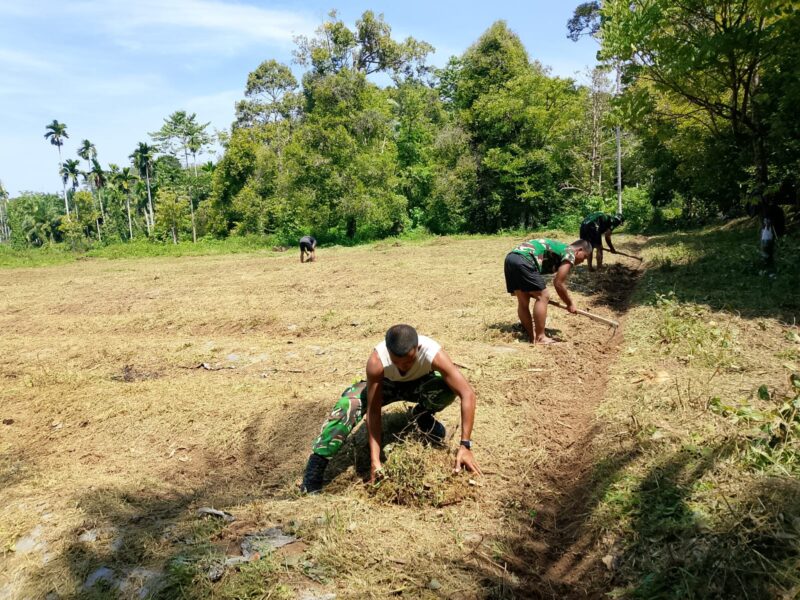 Dengan penuh semangat kebersamaan, personel TNI dan warga bahu-membahu membersihkan lahan dari semak belukar dan tanaman liar. Lahan tersebut nantinya akan dimanfaatkan sebagai area produktif guna mendukung kebutuhan pangan masyarakat setempat.