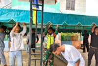 Babinsa Koramil 08/ Blangpegayon Kodim 0113/ Gayo Lues bersama warga binaan gotong royong mendirikan dan memasang tenda dalam rangka kegiatan Peringatan Isra Miraj, di…