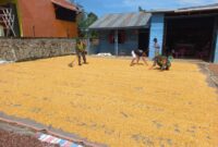 GAYO LUES-Babinsa Koramil 08/Blangpegayon Kodim 0113/ Gayo lues serda Zulkifli dan Koptu Karmadi membantu masyarakat binaan untuk menjemur jagung pada saat pasca panen, didesa…