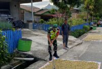 Babinsa Koramil 10/Pantan Cuaca, Kodim 0113/Gayo Lues Serda Adek Afriansyah bantu warga menjemur biji Kopi yang baru siap digiling di desa Remukut, Kecamatan Pantan…